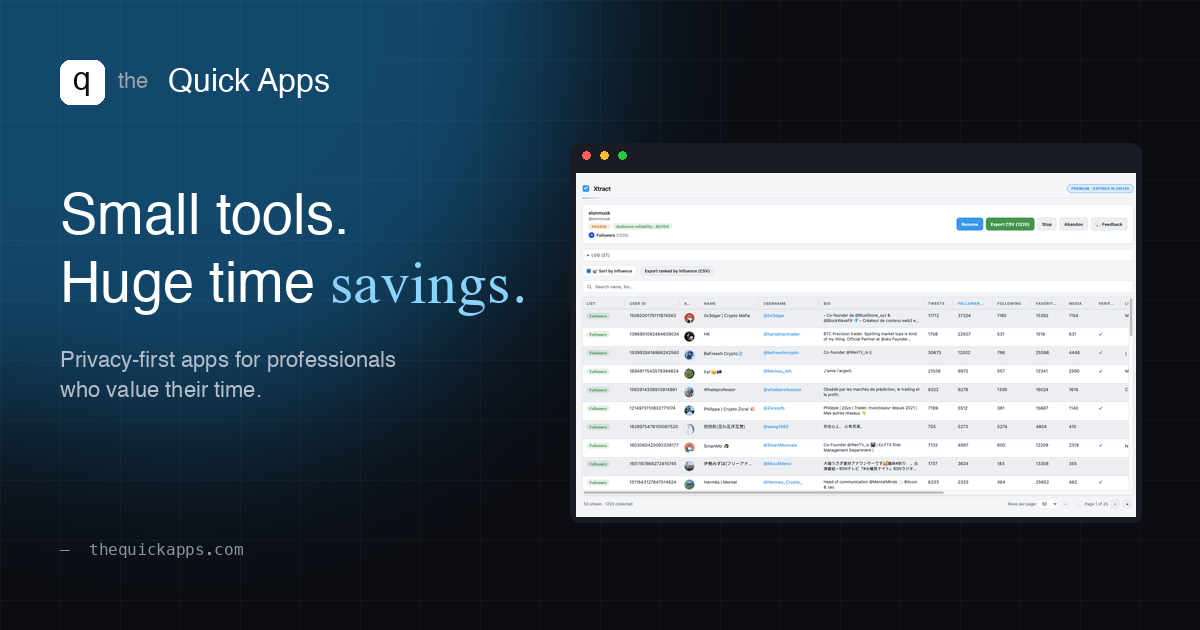 A Chrome extension built for growth hackers, recruiters, crypto analysts and journalists. It runs entirely in your browser, using your own X session. We never see your data.